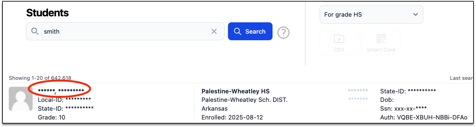 (Note: All student names and IDs are masked with asterisk for training purposes. Users will be able to view this information.)