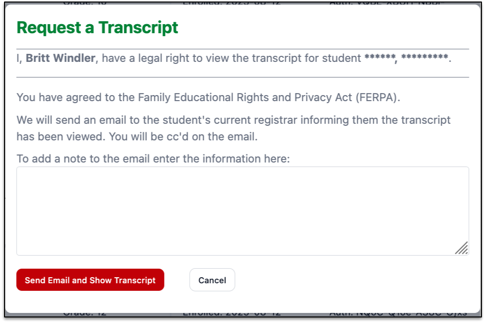You can add a note to be included with the transcript-request email. Click “Send Email and Show Transcript” and the transcript will appear:
