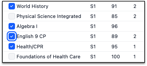Notice the check boxes to the left of the courses taken a previous district. For courses you wish to copy from the transcript to eSchoolPLUS at the current district, click the check boxes: