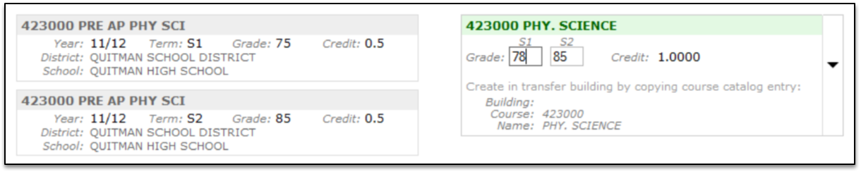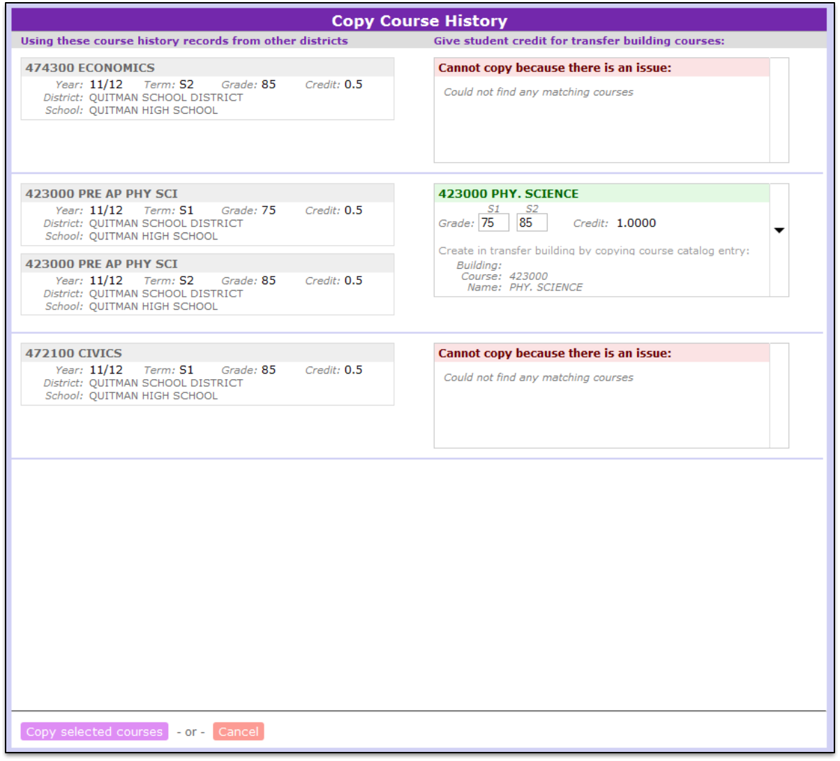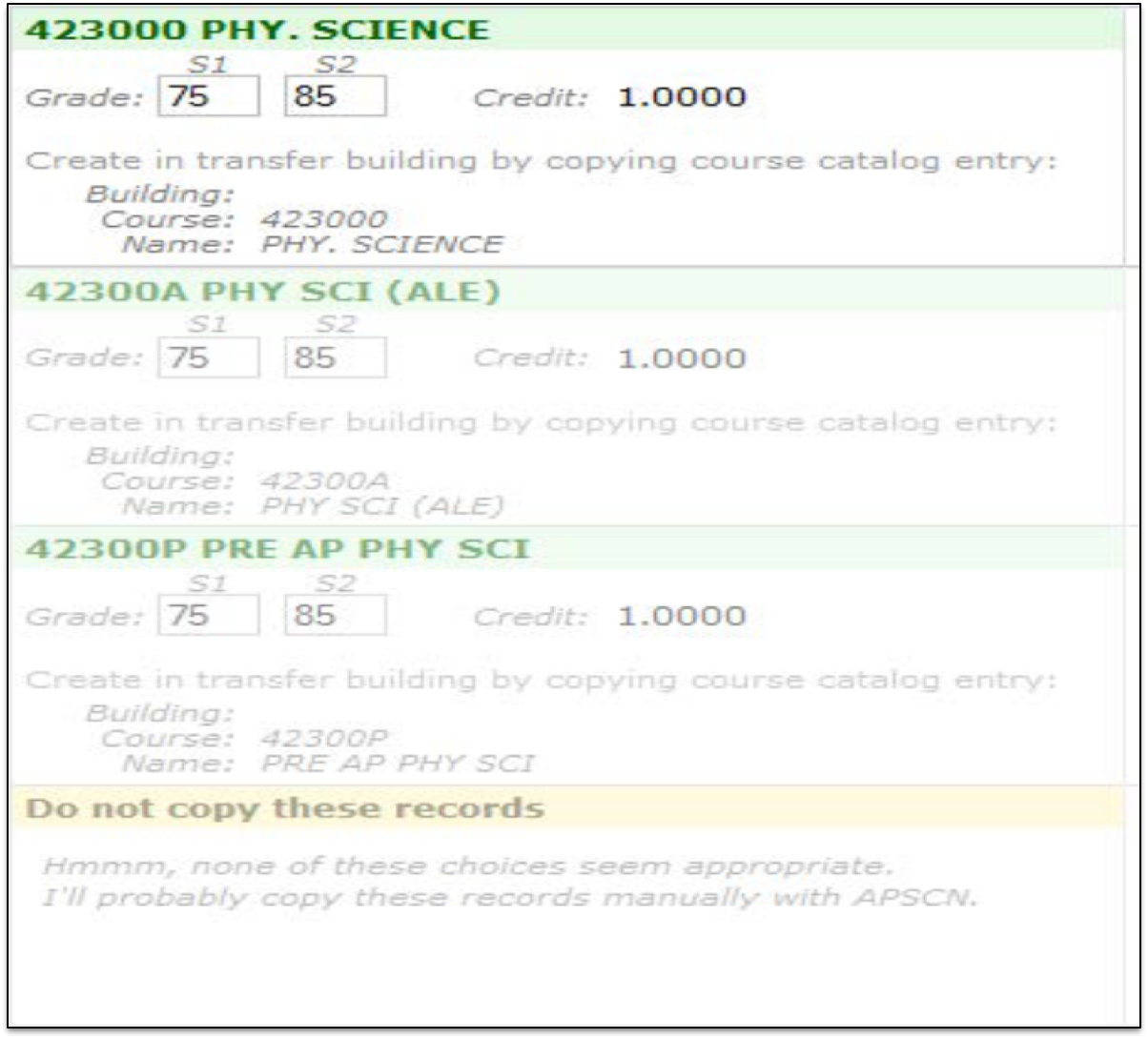 On the left are the courses that were checked on the transcript to be copied. In the second column, you will see a drop-down box that will show all matching unique course names and course codes found in the current district.
